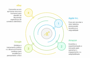 - eBay: concentra-se em aprimorar seus recursos humanos para atender às demandas específicas do comércio eletrônico, valorizando o desempenho dos colaboradores para alcançar altos padrões e apoiar os objetivos estratégicos da organização.